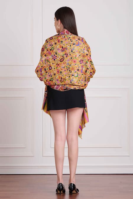 Yellow wool pashmina stole featuring floral kalamkari embroidery with a colorful border