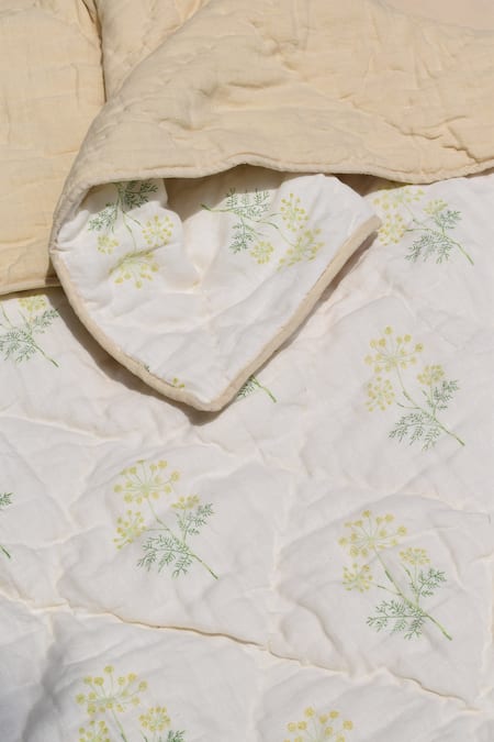 White, beige blanket handblock printed with namesake variyali print on 100% soft linen fabric, this reversible blanket has a cotton filling inside and hand quilted in a diamond shape, enhancing the botanical block print within.