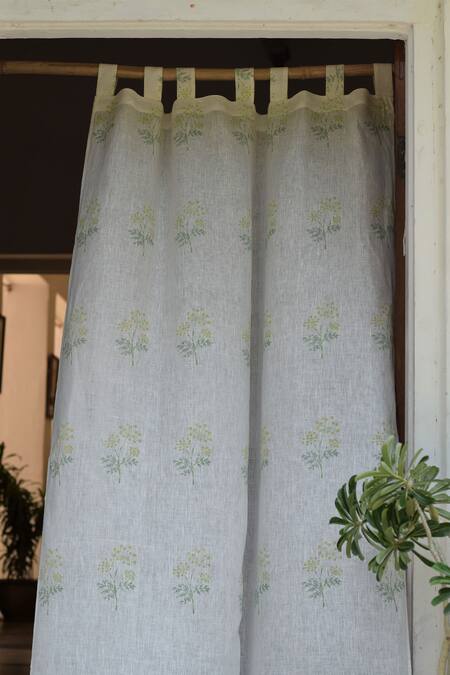 White, beige curtain with handblock printed with variyali botanical print on 100% soft linen fabric.