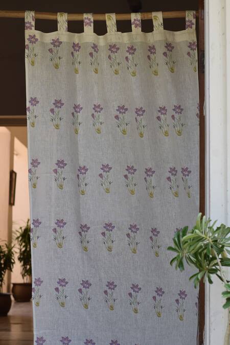 White, purple curtain with handblock printed with namesake zafran botanical print on 100% soft linen fabric.