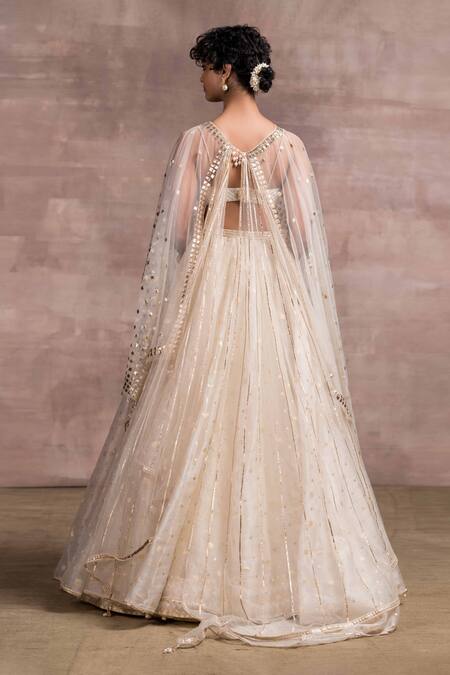 Ivory lehenga with an under-layer of gold chevron borders. Comes with textured bustier with fringe embellishment and a sheer cape with square-cut gota embroidery and gota-lined wings extended in the back.