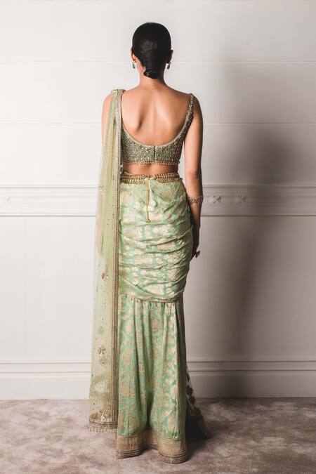 Embroidered >Pre draped saree >Bead tassels >Deep U-back >Closure: Blouse: Back hooks