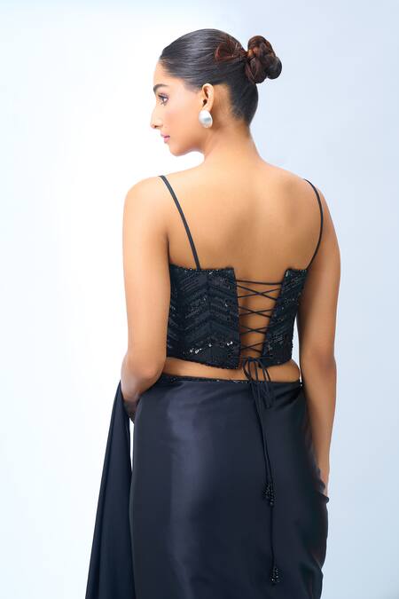 Black corset featuring intricate sequin embellishments and a sleeveless design