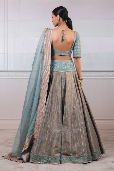 Jade lehenga with floral brocade motifs, gota & a lightly embroidered brocade border. Paired with blouse embroidered with kasab, resham & sequins & sheer silk ombre dupatta with mukaish all-over with gota borders.