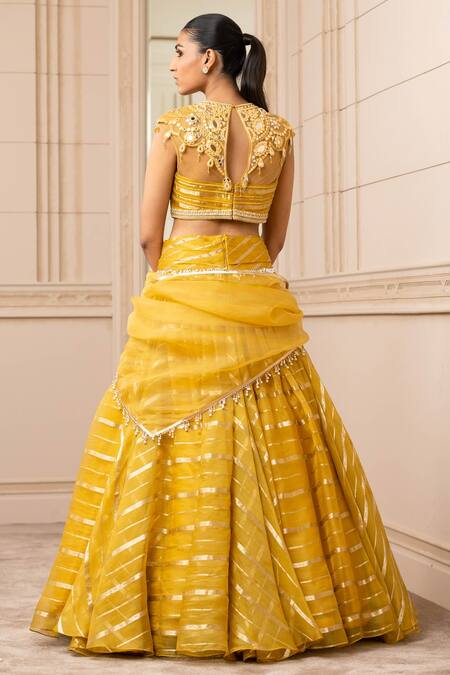 Yellow Silk Organza Brocade Stripes Mirror Round Cascade Draped Lehenga Set