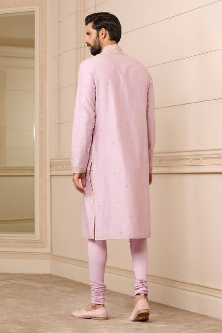 Purple kurta featuring a mandarin collar, long sleeves, and button front closure. Paired with a stretch poplin churidar and designed with floral linear embroidery and delicate French knots.