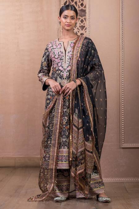 Black chanderi kurta featuring floral and paisley prints with kashida thread embroidery on the yoke. Paired with a flared trouser and a silk dupatta with pipe tassel borders.