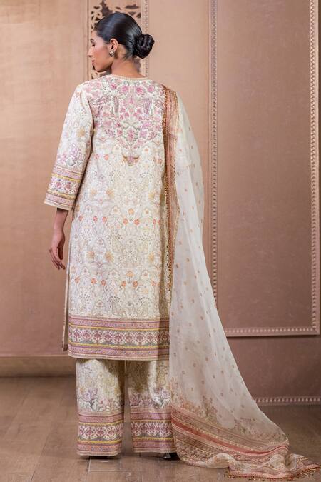 Ivory chanderi kurta featuring floral and paisley prints with kashida thread embroidery on the yoke. Paired with a flared trouser and a silk dupatta with pipe tassel borders.