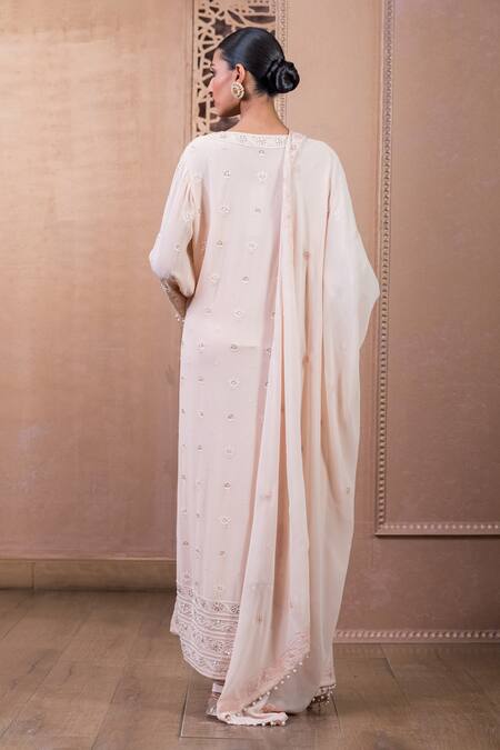 Blush kurta featuring chikankari and sequin hand embroidery in floral placement pattern. Paired with churidar and embellished with a pearl tassel border.