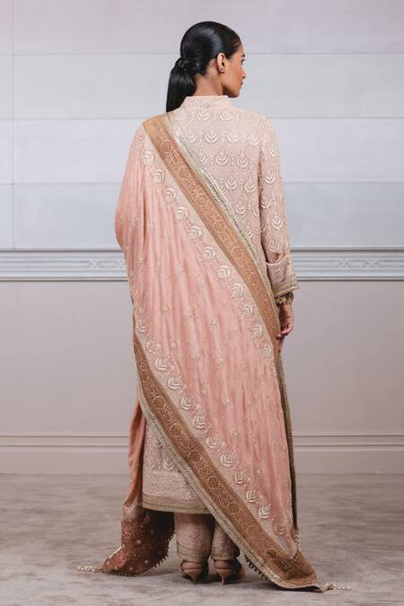 Old rose silk chiffon straight cut kurta with front opening & an all-over chikankari jaal embroidery. Paired with a handloom dupatta with chikankari work & mukaish embroidery & silk dupion trouser with a chikankari cuff.
