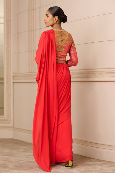 Red pre-draped saree in satin featuring an embroidered waistband and front tassels. Paired with a gold jewel-printed blouse in foil-jersey, adorned with crystals and a round neckline.