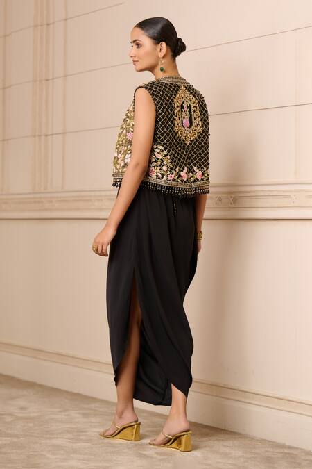 Black gown featuring a draped dhoti silhouette paired with a hand-embroidered tulle gilet. The gilet showcases botanical and jaal motifs and is complemented by a beaded belt.