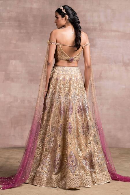 Fuchsia & beige kalidar laser-cut lehenga with gota-work & bejewelled with diamonds. Paired with an off-shoulder blouse and attached draped-wings in luscious ombr shades with crystal embellishment.