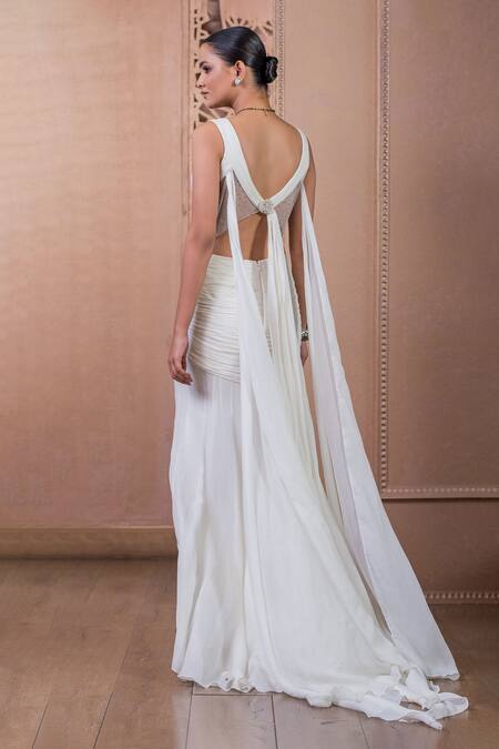 Ivory saree gown in silk chiffon featuring a draped silhouette with crystal embellishments