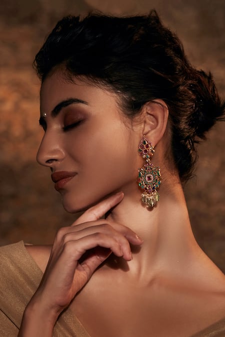 Multi color dangler earrings featuring an intricate design embellished with tourmaline, hand-cut stones, and fresh water pearls