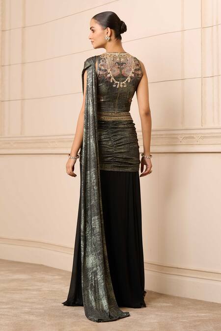 Black concept saree made from foil jersey and georgette, featuring hand embroidery on the waistband. Paired with a sleeveless jewel-printed blouse in foil-jersey, adorned with crystals.