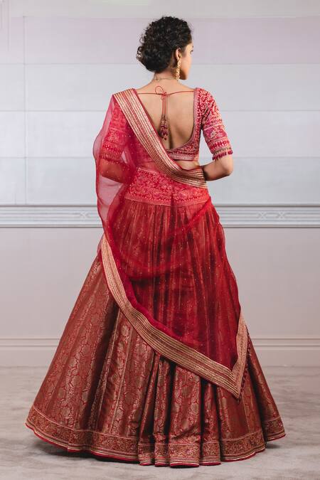 Red Brocade Scoop Neck Embroidered Bridal Lehenga Set