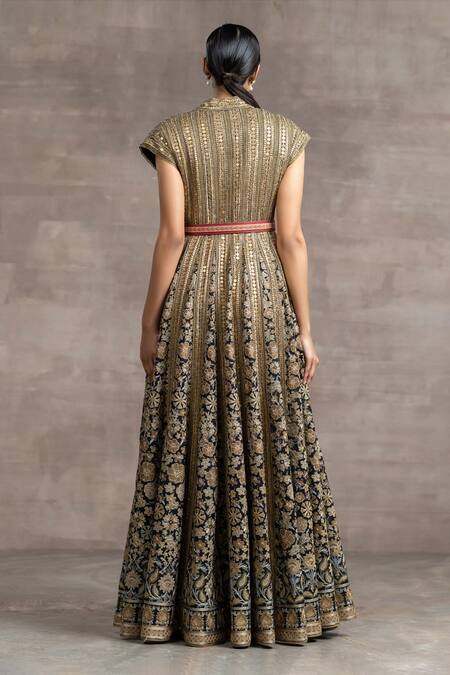 Black anarkali-style long jacket, embroidered in zari thread work all over and features a zardozi border. Paired with a bustier and trousers with similar zari work on the waistband.
