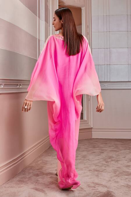 Pink shaded kaftan with placement brocade trim embroidered neckline. Comes with slip.