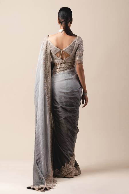 Grey ombre georgette tissue saree with dome motif hand embroidered border. Paired with sheathing blouse enhanced with 3D flower sleeves & bead tassels.