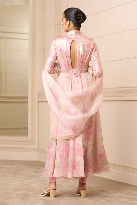 Mauve and pink floral hand-painted Anarkali featuring a plunging V-neckline and embroidered waistband with 3D flowers. Paired with a stretch net churidar and a floral print scarf with bead drops.