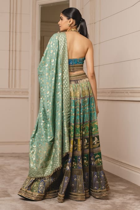Green Jacquard And Brocade Sequin & Beads Halter Floral Motifs Lehenga Set