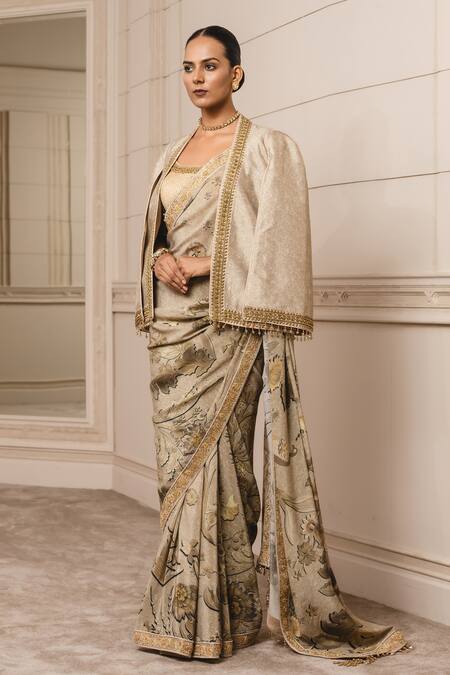 Golden cape with floral prints, embroidered border and features tassel detailing on the hem.