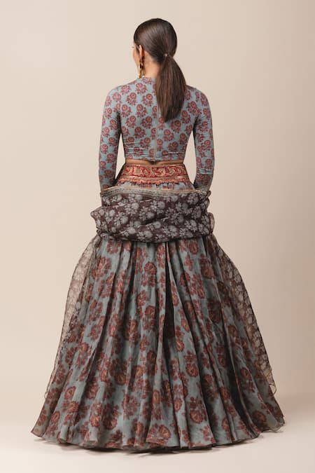 Grey Silk, Satin Organza, Jersey Round Floral Print Lehenga Set