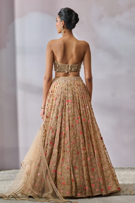 Beige lehenga featuring box pleats and floral vine embroidery. Paired with a tube bustier adorned with sequins, beads, and a lace-bordered scarf.