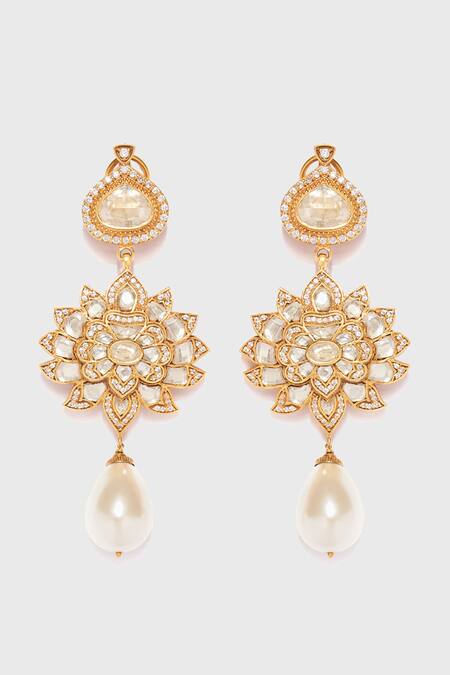 Gold Plated Pearls, Zari Floral Zircon Embellished Droplet Earrings