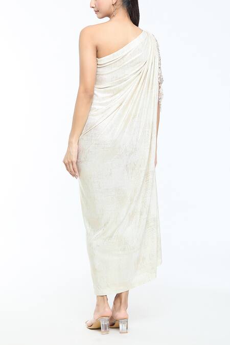 Ivory one shoulder draped dress crafted from foil jersey featuring crystal drops embellishments on the sleeve