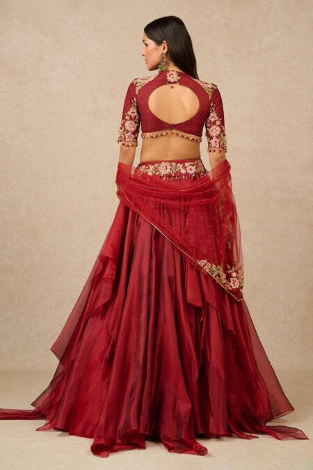 Maroon Tulle, Organza Embroidery, Beads Gara Blouse Ruffle Lehenga Set