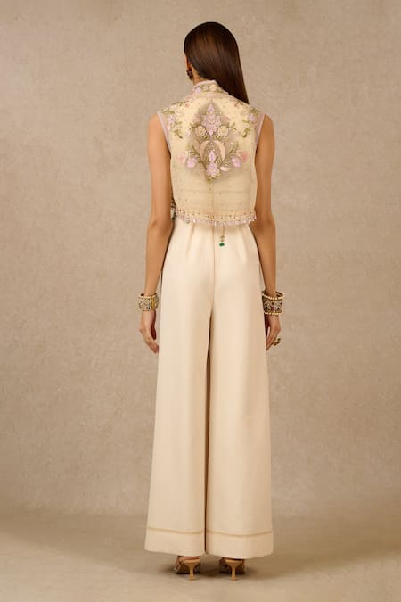Ivory Tulle Crystals, Beads High Neck Gara Thread Embroidered Gillet