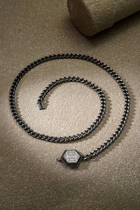 Gunmetal grey chain belt featuring a hexagonal clasp
