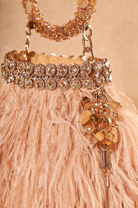Beige gold handbag featuring handcrafted ostrich feathers and jeweled elements