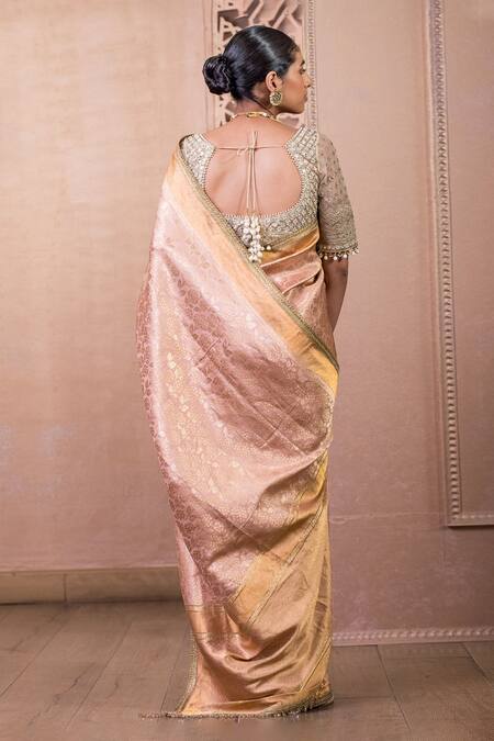 Pink saree featuring floral brocade woven motifs and a stone embroidered border. Comes with unstitched blouse fabric and a contrast gold border.