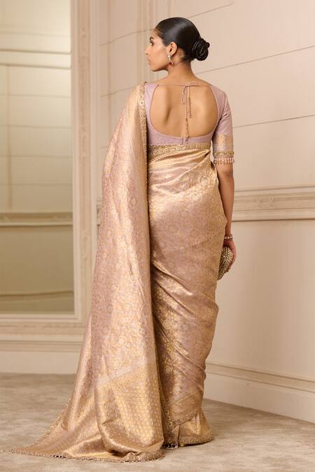 Pink brocade saree featuring hand-embroidered borders. Paired with matching unstitched blouse fabric.