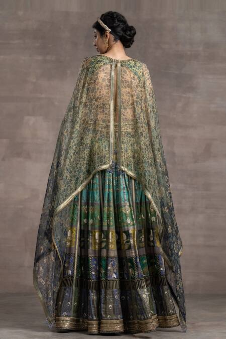 Sea foam colorful kalidar jacquard lehenga with floral, bird & elephant printed motifs, highlighted with gold embroidered borders on the waist and hemline. Paired with stylized printed blouse that comes attached with a cape-style dupatta.