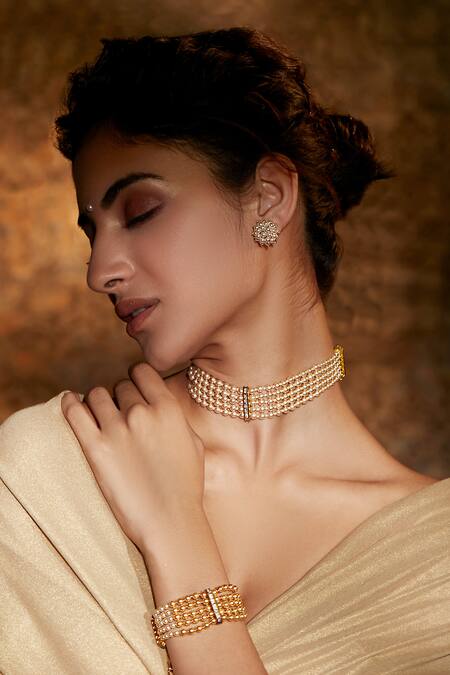 Gold toned choker featuring five layered pearl strings with a TT charm at the back