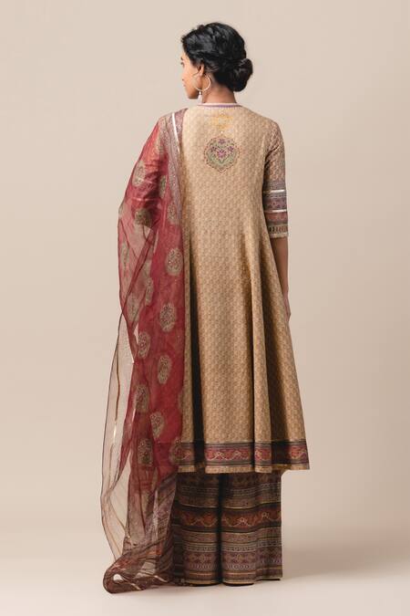 Beige kalidar kurta with jewelled motif & placement embroidery. Comes with printed palazzo pants.