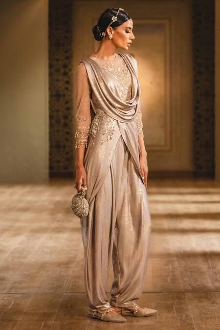 Oyster jumpsuit with front cowl drape, floral motif resham work & sheer sleeves.