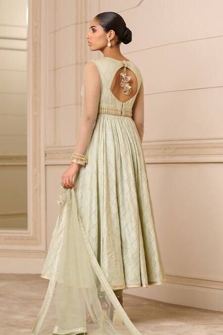 Green anarkali featuring a hand-embroidered bodice with mukaish work. Paired with a stretch net churidar and a tulle scarf with embroidered borders.