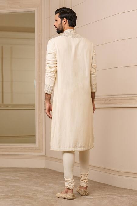 Ivory kurta featuring intricate floral embroidery in zari pita on the neckline and sleeves. Paired with a stretch poplin churidar, this set includes pockets on the sides and side slits.