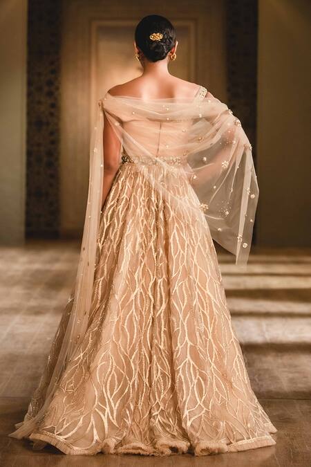 Gold Tulle Off Shoulder Anarkali Set