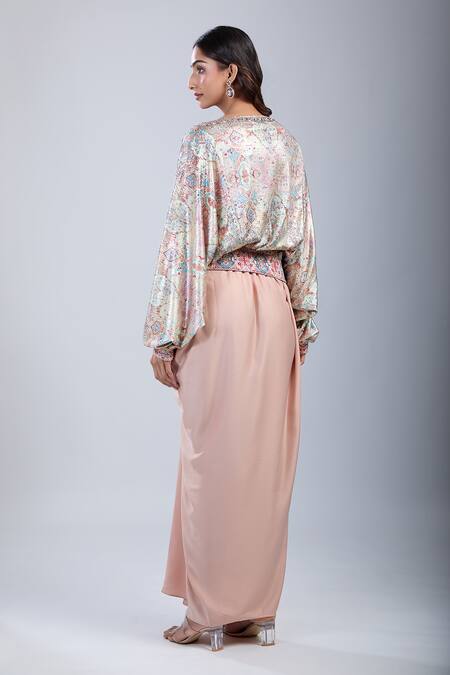 Embellished neckline for added elegance, Unique tile print design, Draped sleeves for a stylish look
