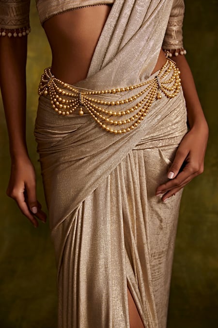 Gold asymmetric layered belt featuring poth Japanese, diamond chakri, crystal pearl, and jewel embellishments