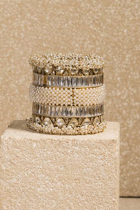 Gold and ivory kada featuring pearl mesh embellishments and rose cut zircon details