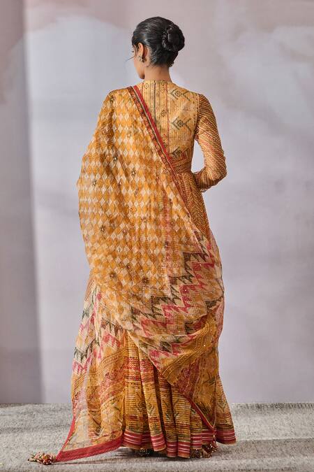 Mustard textured cotton Anarkali featuring all-over multi-color phulkari print with pleated draped panels. Paired with churidar and a printed dupatta with embellished tasselled edges.