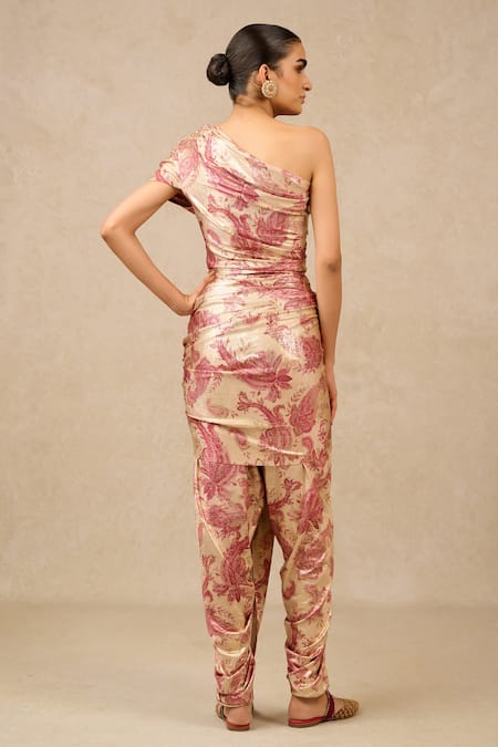 Gold foil jersey top featuring a one shoulder neckline with embroidered details and asymmetric drapes. Paired with a printed dhoti trouser showcasing pleated cowl draped panels.
