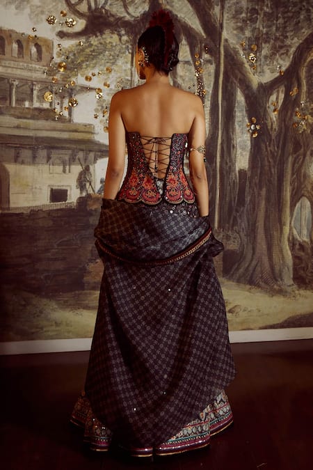 Back criss cross corset blouse, Zardozi & aari work, Printed lehenga & cape